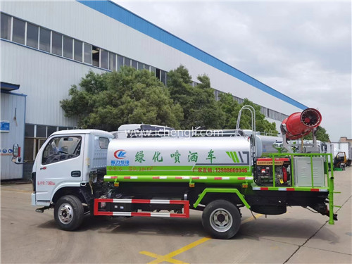 根據客戶要求:罐體容積約5立方。專用功能為:前沖后灑,帶側噴,罐體后帶工作平臺,平臺上安裝綠化灑水高炮,灑水炮可全方位旋轉,并有多種雨狀可調節(大雨、中雨、毛毛雨、霧狀),泵可自吸自排,帶自流閥,帶消防接頭,帶過濾裝置。根據客戶特殊要求后平臺加裝全自動柴油機霧炮噴霧機組,可做降塵實用,遙控操作。車輛交付客戶特別滿意!感謝信任!