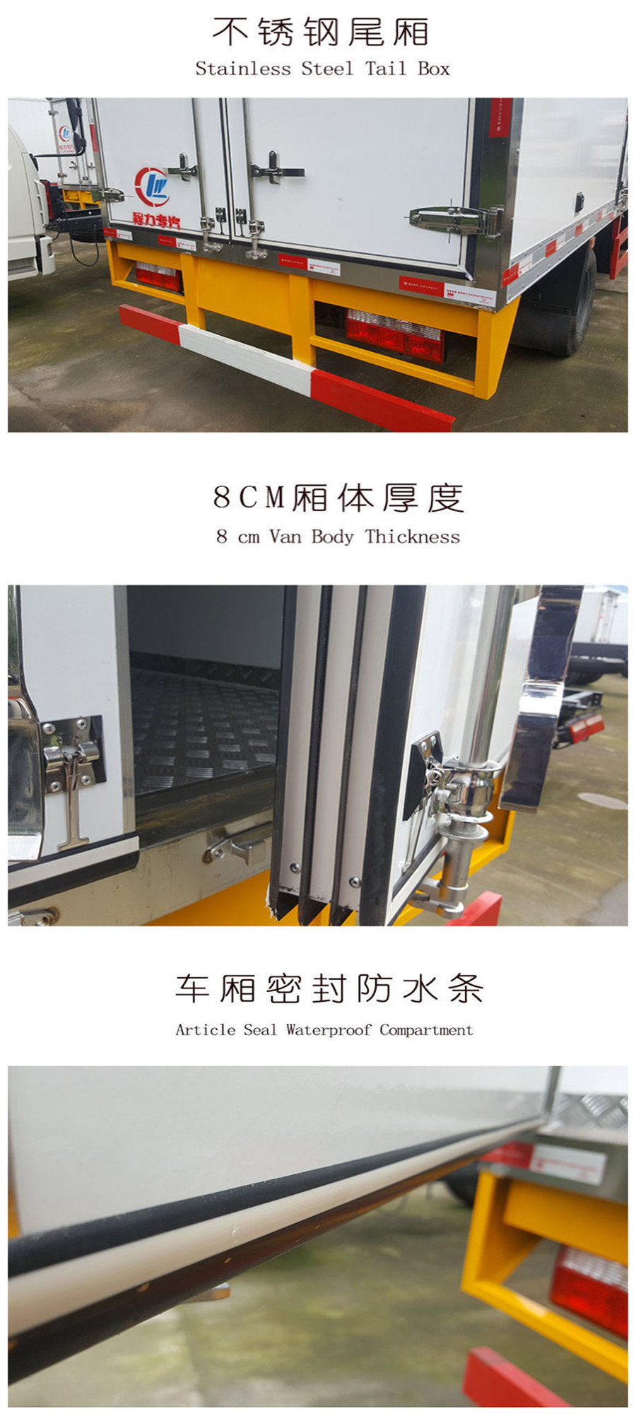 九 選裝配置:可選裝廂體側門(單側門或雙開門),可選裝鋁合金導風槽(導風槽有助于冷氣循環,提升制冷效果),可選裝廂體頂部加固肉勾滑道(直滑道 或 對接互通式拐彎滑道)。可選裝廂體內部采用全面不銹鋼材質(海鮮運輸必須加裝,海水有腐蝕性),可選裝280V-380V外接電源(停車熄火后可插電冷機繼續制冷工作),可選裝溫濕度監控記錄儀(帶打印功能)。