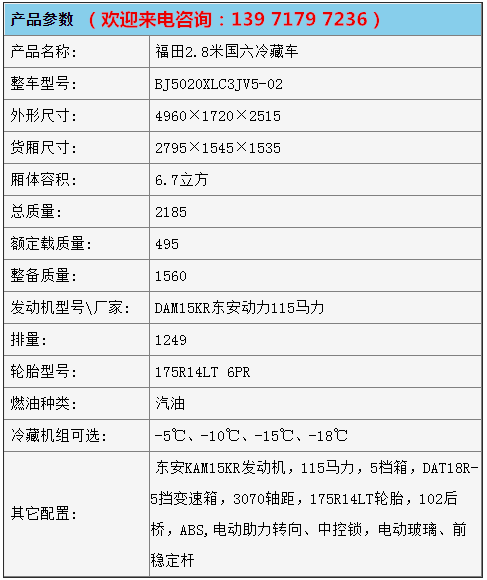 六、選裝配置:可選裝廂體側門(單側門或雙開門),可選裝鋁合金導風槽(導風槽有助于冷氣循環,提升制冷效果),可選裝廂體頂部加固肉勾滑道(直滑道 或 對接互通式拐彎滑道)。可選裝廂體內部采用全面不銹鋼材質(海鮮運輸必須加裝,海水有腐蝕性),可選裝280V-380V外接電源(停車熄火后可插電冷機繼續制冷工作),可選裝溫濕度監控記錄儀(帶打印功能)。