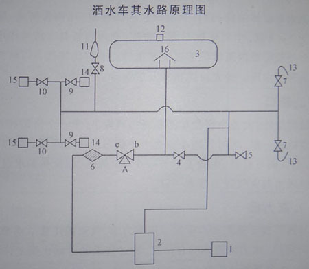 1、取力器 2、水泵 3、水罐 4、連通閥 5、消防球閥 6、過濾網(wǎng) 7、前沖閥 8、灑水炮閥 9、側(cè)噴閥 10、后灑閥 11、灑水炮 12、罐口蓋 13、前沖器 14、側(cè)噴蓮花頭 15、后灑砣 16、防旋板 ABC、三通四位閥
