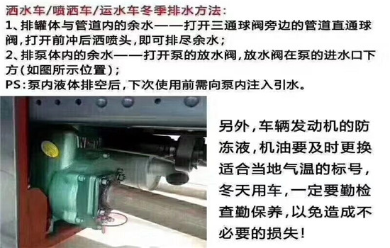 在寒冷的冬季里,應將灑水車水泵和水管內的水放空,以防凍裂。我國北方一般嚴冬不再施工,所以施工一結束,就立即將水泵水管內的水排空,防患于未然。