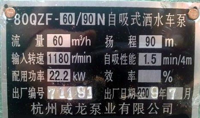 客戶朋友可以參考了以上信息來確定自己的灑水車水泵型號,一般灑水車水泵上可以找到一個類似下面的灑水車銘牌。