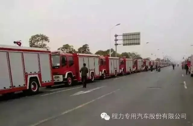 下圖是柬埔寨公安部來程力檢查驗收115臺慶鈴五十鈴泡沫消防車和發車場景圖: