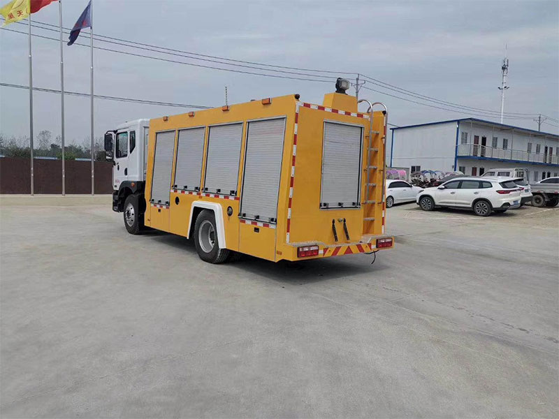 東風多利卡D9工程黃牌搶險救援車,標志標識。液壓支腿,手動機械支腿,手電一體絞盤,爬梯,發電機功率,電纜線根據各尺寸選裝。廂體左右兩側共設有八個鋁合金卷簾門,內可放置發電機組、電纜卷盤、救援器材等專用設備。器材骨架Ⅱ安裝在艙體右側折疊椅的左側,滅火器安裝在器材骨架Ⅱ后側。氣防車整體結構為車體、駕駛室、艙體。
