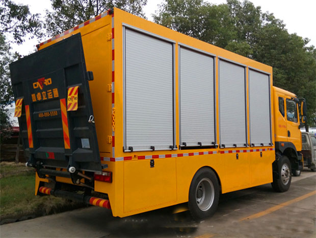 東風多利卡D9工程黃牌搶險救援車,本實用新型的有益效果:綜合性、一體化程度高,結構布置科學合理。車廂尾部可選擇安裝2T徐工折臂吊,滿足救援現場設備和重物吊裝,一車多用。結構布局合理,現代科技感強,實用性高??刹僮餍詮?,封閉部分可根據車載的設備的尺寸和不同的用途進行分配。廂體為特殊材質,可運輸、防雨、防火、阻燃、防塵、防銹、降燥,隔震、長期抗震。配備移動氧源,空氣呼吸器等,在礦山、石油與化工,化工品毒氣泄漏中科發揮巨大作用。氣防車本身可以用發動機發電,在發動機異常不能發電時,還可以用市政供電來為照明燈給出電力。因為考慮到搶險救援車的要求,所以將左右側窗改為盲窗結構。