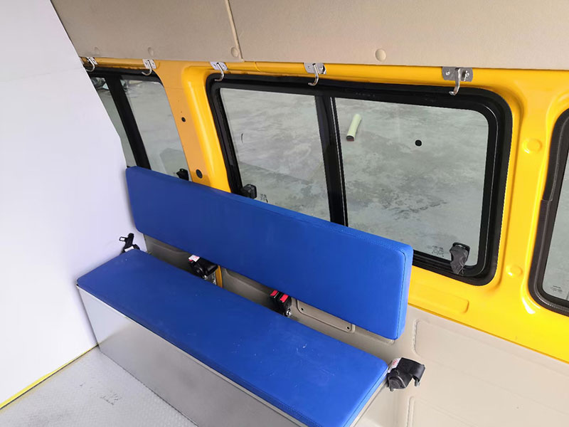 5-9人座搶險救援車_福特V348氣防站氣防車搶險救援車,艙體的前端為中隔板,該中隔板上設有推拉窗、液晶顯示屏、對講機,艙體內前部兩側設有折疊椅、中間設有折疊桌。氣防站氣防車的總體結構為車體、駕駛室和艙體。全方位做工精湛,全車真皮座椅。器材骨架Ⅰ安裝在折疊椅的右側,靠近艙體左側的位置,可放發電機的機艙和多個置物艙。