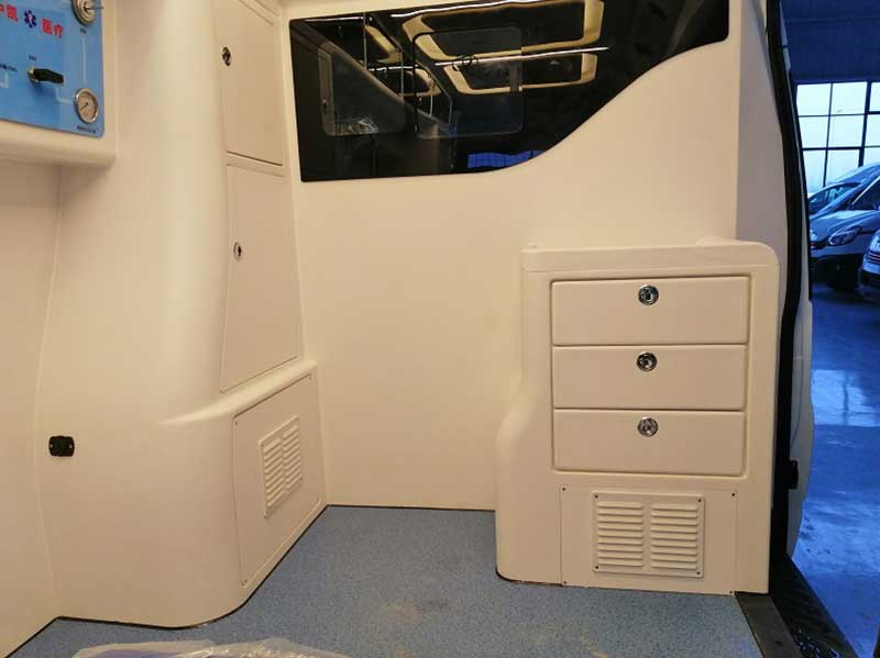 福特新時代全順V348短軸救護車上裝配置:帶儲物柜和單人座椅的柜式床安裝在醫療艙的右側,帶卷軸式安全帶。短途轉運的救護車,設備配備能夠相對易于些,只需要擔架、氧氣和輸液掛鉤即可。流線型外表,行駛時能有效引導周圍氣流,減少空氣阻力和燃料消耗,有助于提高汽車行駛穩定性和發動機的冷卻條件,車身內部具有超級好的通風。艙內有定向排風系統,可將空氣過濾器過濾后排放到外界,不污染外界環境,最大限度地減少了醫患人員交叉感染的可能。消毒燈1只。氧氣流量和壓力閥。醫生座椅是單獨的,安裝在醫療艙前部,安全帶是帶卷筒式的。