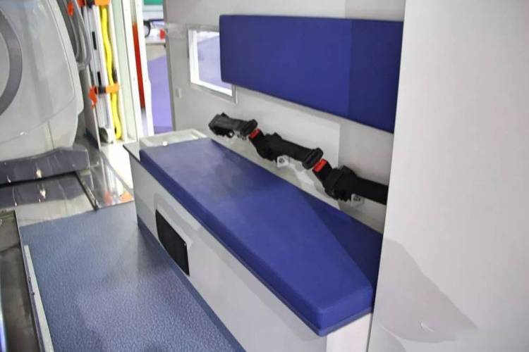 依維柯移動5G腦卒中負壓救護車,醫療艙右側安裝單人標準座椅 1 張(配三點式安全帶),左側安裝長條標準座椅 1 張(配二點式安全帶)。醫療艙內配置暖氣系統。供養/呼吸:氧氣瓶、氧氣袋、呼吸面具、牽引裝置。醫用污物桶是腳踏式的。醫療艙頂部安裝隱藏式輸液瓶懸吊裝置。