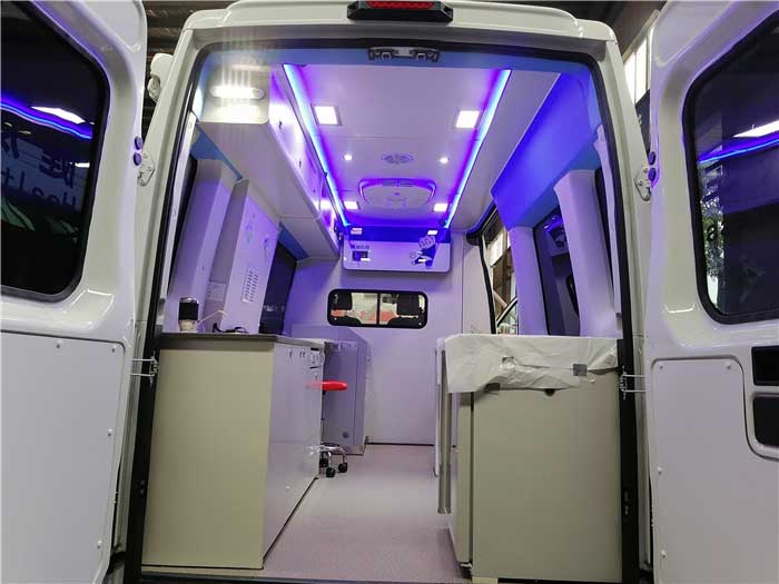 依維柯歐勝高頂疫苗接種醫療車,后門采用的是LED照明燈,節能環保。頂部12V節能的LED照明燈,壽命長:LED為固體冷光源,環氧樹脂封裝,抗震動,燈體內也沒有松動的部分,不存在燈絲發光易燒、熱沉積、光衰等缺點。配備的有車窗黑色膜、遮陽棚可伸縮、中門固定踏板、中門黃色抗菌尼龍扶手,各種配置都設計的非常人性化。交/直流插座 組合插座,可接三/二孔的多功能插座,交/直流兩用,多功能插座,有利于應用。