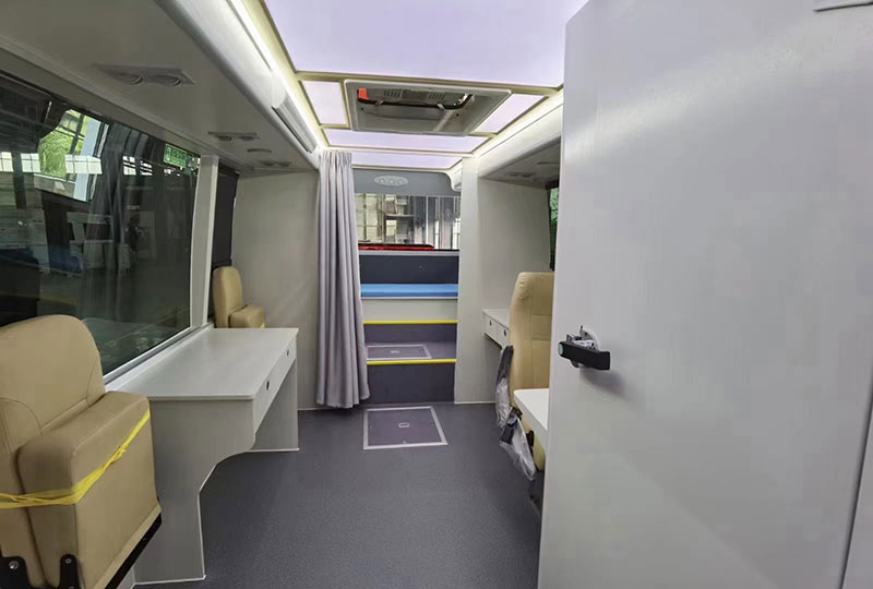 金旅7米體檢車醫療車,體檢信息管理系統:體檢車內配置有線局域網和4G無線網絡,可實現B超、心電圖、DR、純音電測聽等體檢結果數據自動匯總,打印報告;與站內互聯,信息傳回站內。所有設備和存放設備的柜均分別設有減震海綿,避免行車時震動對設備的損 傷。射線防護墻的轉角、連接處、進出門 等處的鉛板交叉重疊方式,確保射線不得直射、折射泄漏。通 過反吸收緩沖原理,抗震水平達5g,使車在行駛過程中加強避震、增大平穩度,有效保護了管球等主要部件安全。琴鍵式開關,選用起來比較可靠。紫外線消毒燈定時、有效殺毒。一個電源轉換開關,24V。