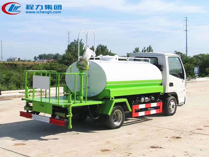 專用配置:罐體容積:3立方米,罐體鋼板為4mm碳鋼Q235材質專用容積板一次成型,罐內隔板具有防波作用,以減輕汽車行駛時罐體液體沖擊;配大功率專用灑水泵,泵可自吸自排;整車前沖、后灑、側噴、后平臺帶綠化灑水炮,灑水炮可全方位旋轉,可連續調成直沖狀、大雨、小雨、毛毛雨;前封頭帶水位計,后平臺主管路帶1寸澆花接口,后爬梯,帶1個消防接頭,帶1個自流閥,1個過濾裝置。