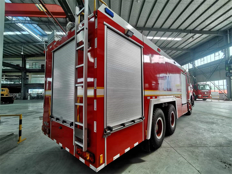 16噸泡沫消防車_重汽豪沃后雙橋泡沫消防車,器材箱內設置有儲物盒,可以放置一些小型工具。載液罐體應用的優質碳鋼材料,罐體內部應用特殊底漆噴刷,防止生銹、腐蝕。設有工具箱及卷簾門,可放置小型工具。主框架結構選取優質方管焊接,外裝飾板選取碳鋼板焊接。車內器材應用專用夾具固定,器材是由防腐蝕、防震動和防脫落的專用材料制成。