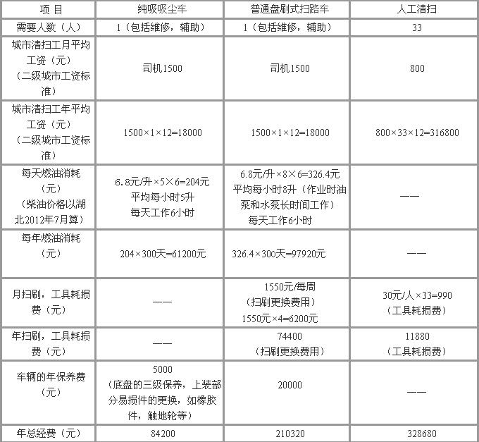 按建設部有關規定:人工清掃定額600平方米/小時,本吸塵車最大清掃能力為58,000平方米/小時,考慮路面污染程度及清掃速度不同,以平均20,000平方米/小時計,相當于33個清掃工的工作量。按每年工作300天,每天工作6小時計算,本吸塵車清掃與普通掃路車清掃,人工清掃費用對比估算如下: