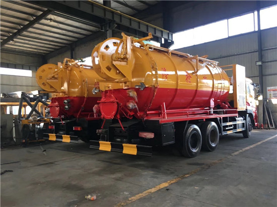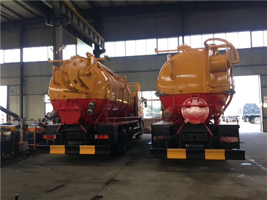 ? 清洗裝置:配天津通潔300升高壓泵, 60米PVC雙層高壓管22通徑高壓管,10個高壓噴頭,兩個水泥蓋,頂部100的互通,水污互通用100的球閥,水罐3寸球閥安在罐體最底部.水倉污倉罐體內噴防銹,后封頭600的液壓口,一個6寸自流,一個4寸的進料口,一個4寸的排污口,側面一個6寸的球閥偷排。后蓋加裝活動可拆式卷盤壹套,右后側一套卷盤,罐體采用8個厚鋼板制作,后蓋上帶一個600液壓口排污,300側邊自流口。