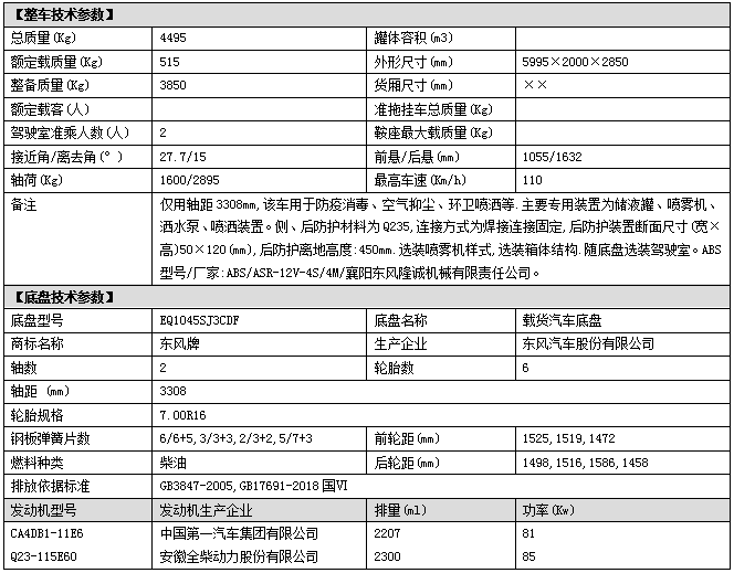 上裝配置:罐體容積約:5立方米,方形罐體制作,罐體鋼板采用Q235碳鋼鋼材,前沖后灑、側(cè)噴、平臺(tái)高炮、自流閥及消防接頭各1個(gè)、水管2根、標(biāo)配億豐泵或金龍泵,后平臺(tái)加裝30米、40米霧炮機(jī)組;其他標(biāo)配。