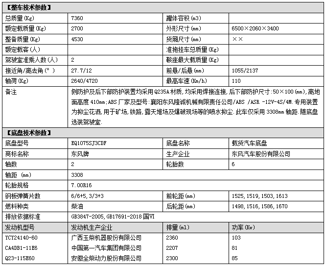 配置二:東風福瑞卡F6系列駕駛室,3308mm軸距,一汽錫柴110馬力(CA4DB1-11E6)發動機,萬里揚5檔變速箱,7.00R16輪胎,空調電動窗,ABS,氣剎,方向助力;